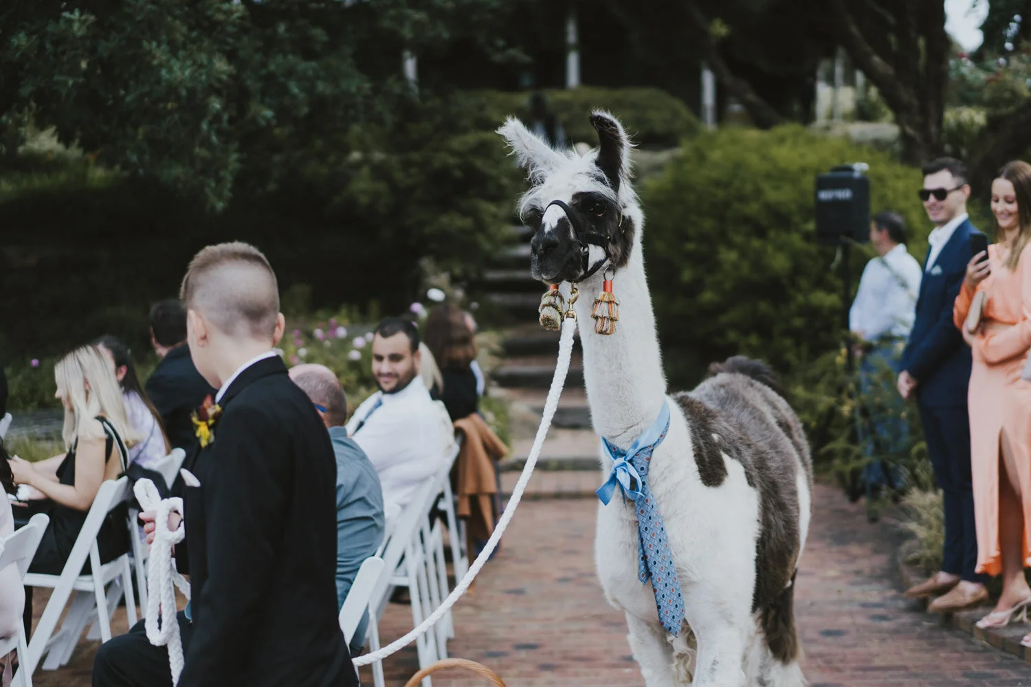 A part of the ceremony the guests certainly won’t forget is the moment the Best Man was asked to present the couple with those all-important rings (what could possibly go wrong?!). After jokingly looking in every pocket in his tuxedo jacket, two very special ring bearers were introduced; Warrigal and Chilli the llamas! Dressed in a pale blue tie and blush pink bow, the ring bearers did an excellent job at presenting the rings and added a bit of light humour to a glorious ceremony.